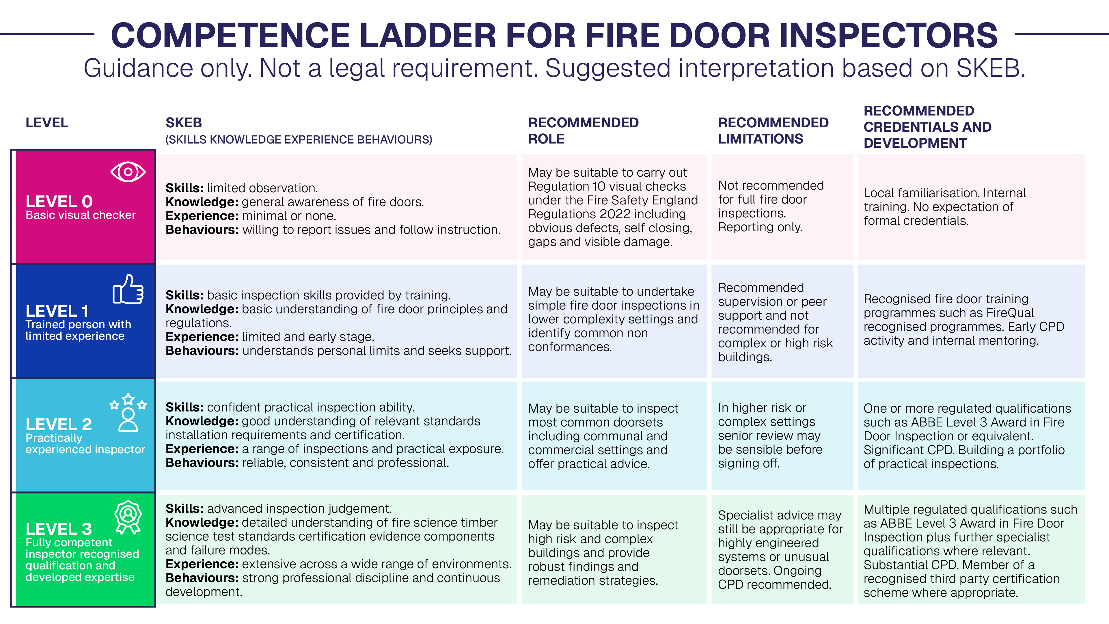 To help explain how inspection capability develops in practice, we use a Competence Ladder for Fire Door Inspectors.